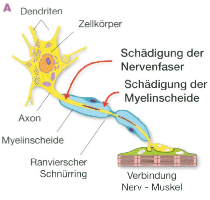 Bestimmung der Nervenleitfähigkeit mittels Elektrophysiologie. Wenn ein Nerv elektrisch stimuliert wird kann an einem entfernten Ort der Impuls gemessen werden. Aus der Stärke und er Verzögerung können Rückschlüsse auf die Nervenfunktion gemacht werden.