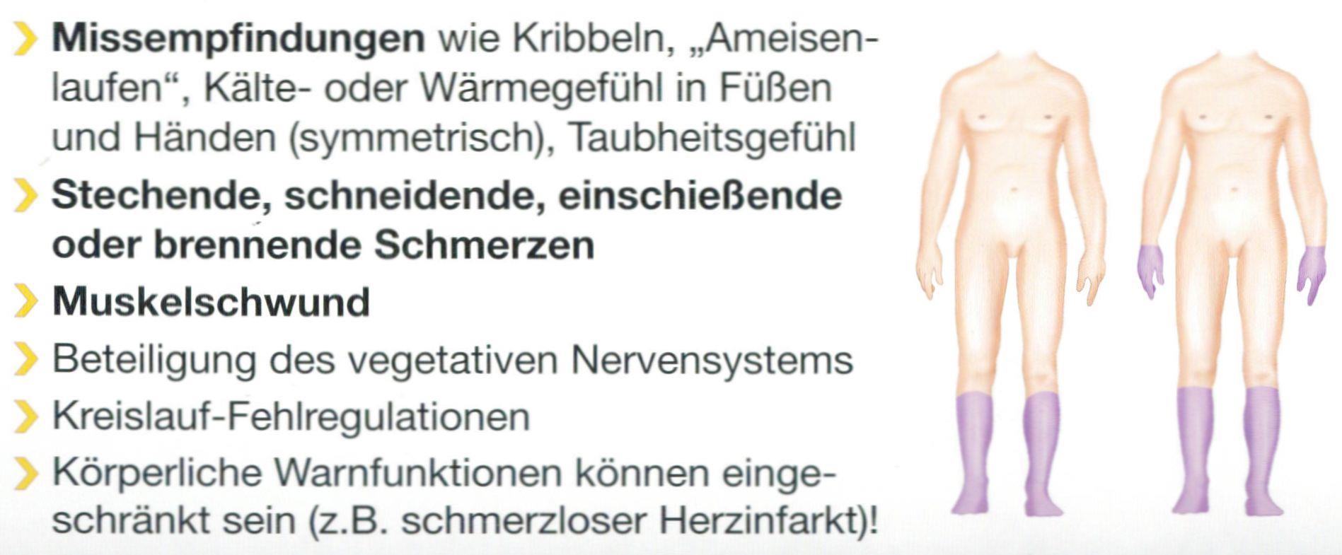 unangenehmen Missempfindungen (typischerweise beidseits, strumpfförmig, an den Füßen beginnend)