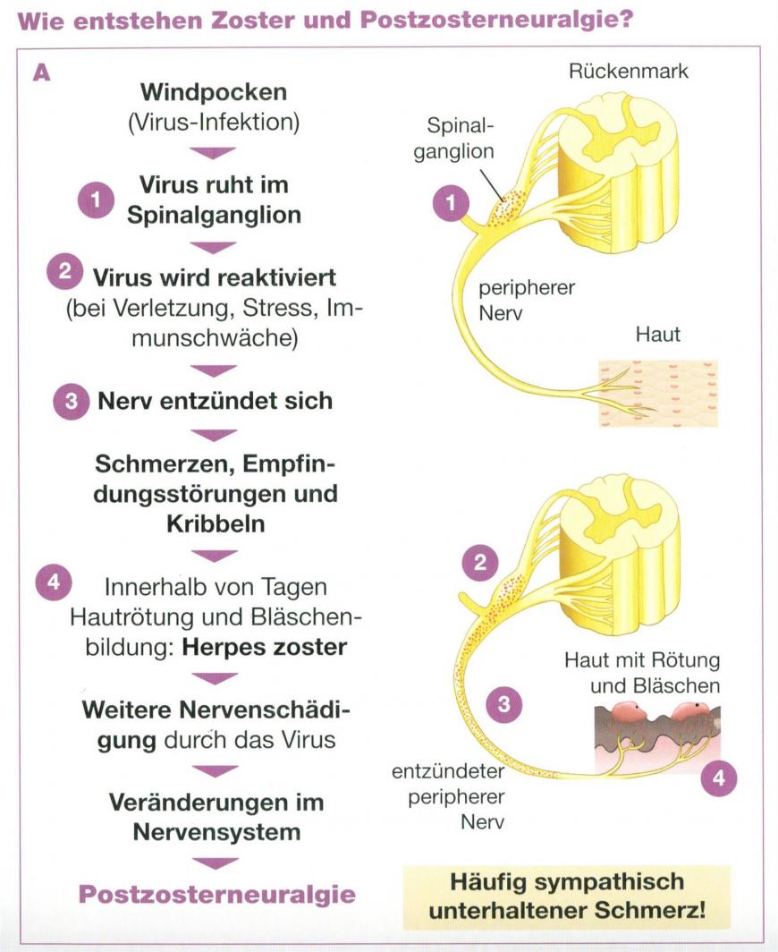 Eine Zooster-Neuropathie entsteht als direkte Folge einer Infektion mit Herpes zooster Viren und ist eine Schädigung der Nerven. Nach einer durchgemachten Windpockeninfektion können die Erreger sich in einem geschützten Teil der Nervenwurzel verstecken. In Phasen einer Schwächung des Immunsystemes verlassen sie ihre Schutzburg und wandern entlang der Nerven bis zur Hautoberfläche. Dort kommt es dann zu den Typischen Bläschen. Als erstes wird die Isolierung der Nerven geschädigt, darum könne Impuls von z.B. Gefühlsfasern aus Schmerzfasern überspringen. Auch kommt es zu Funktionsstörungen der Nerven (Kabelbrüche, Wackelkontakte).