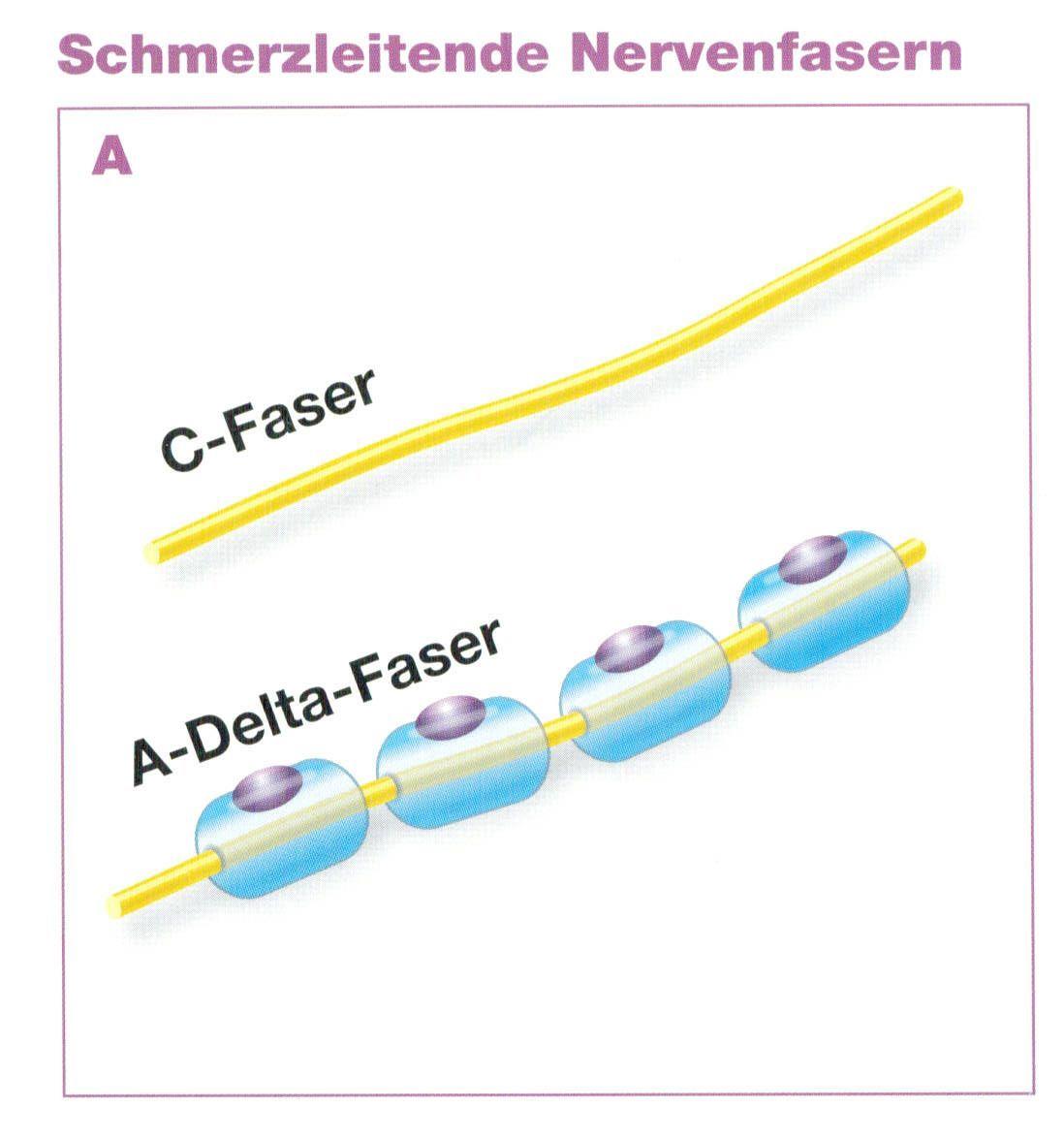 Sie kennen alle, dass wenn Sie sich das Schienbein gestoßen haben, ein scharfer, schneller Schmerz sofort zu spüren ist. Dieser wird über die schnellen A-delta Fasern geleitet.